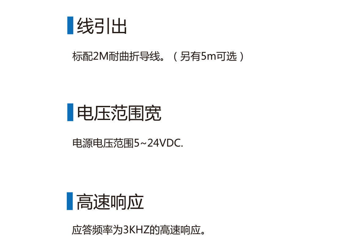 *國產(chǎn)行業(yè)首創(chuàng)傳感器專用芯片*內(nèi)置穩(wěn)壓模塊3.3V~32V寬電壓輸入*標(biāo)配常開常閉雙路輸出抗電磁干擾能力強(qiáng)*標(biāo)配正負(fù)短路、輸出短路、輸出逆接三重保護(hù)*標(biāo)配2米柔性線可根據(jù)要求定制線長、定制拖鏈傳感器線*標(biāo)配五種超小尺寸不同安裝形狀的微型傳感器適合小型電子設(shè)備