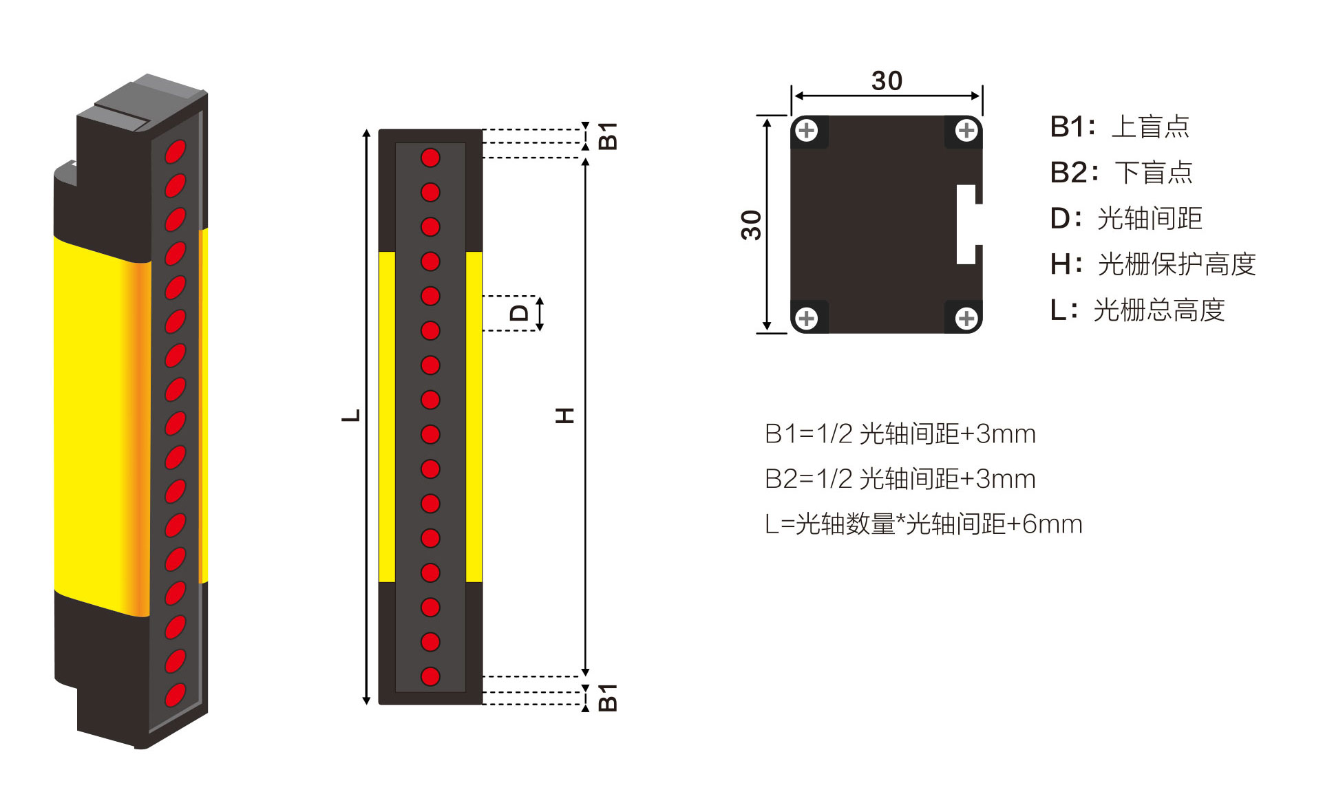 (2)保護(hù)高度指安全光柵有效保護(hù)高度,從第一棵光束到最后一棵光束之間的距離被稱為有效保護(hù)高度。有效保護(hù)高度也是機(jī)械需要的保護(hù)高度。