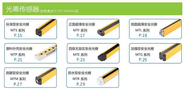 通用型安全光柵、正面超薄型安全光柵、側(cè)面超薄型安全光柵、塑料外殼安全光柵、四級(jí)無盲區(qū)安全光柵、加強(qiáng)型安全光柵、測(cè)量型安全光柵及防水光柵